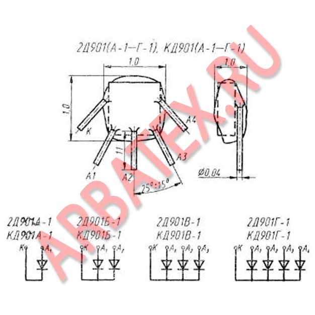 Диодные матрицы 2Д901А1 состоят из одного (2Д901А—1, КД901А-1), двух (2Д901Б-1, КД901Б-1), трех (2Д901В-1, КД901В-1) и четырех (2Д901Г-1, КД901Г-1) кремниевых, пленарных диодов, с общим катодом.