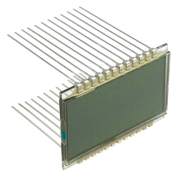 Жидкокристаллические индикаторы ИЖЦ – индикаторные устройства из жидких кристаллов, предназначены для отображения цифровой и буквенной информации. Рассчитаны на переменное напряжение от 3В до 5В, ток потребления от 1мкА до 25мкА. Исполнение жидкокристаллических индикаторов ИЖЦ плоское, стеклянное, контактные площадки расположены на двух противоположных сторонах дисплея индикатора. Вывода контактных площадок в верхнем ряду нумеруются слева направо, в нижнем – справа налево. Высота отображаемого цифрового знака от 5 мм до 16 мм. Помимо отображения цифровой информации на дисплей индикатора наносят и другие символы. Монтаж жидкокристаллических индикаторов ИЖЦ на плату осуществляется через токопроводящую резину, анизотропный токопроводящий клей или с помощью металлических выводов по THT-технологии (выводы монтируются непосредственно в сквозные отверстия печатной платы) с помощью пайки.