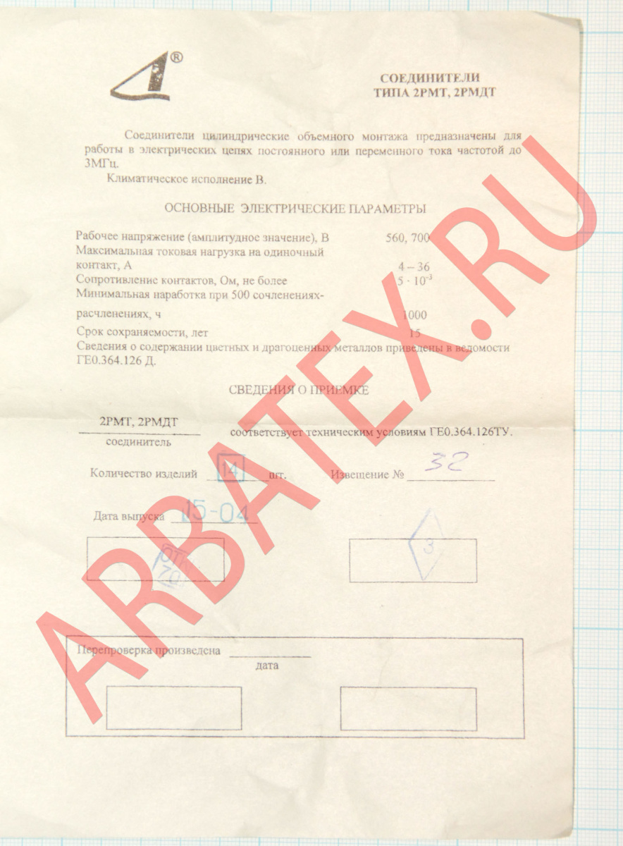 2РМДТ – Тип разъема - соединитель электрический низкочастотный цилиндрический негерметичный для соединения длинных электрических цепей.
